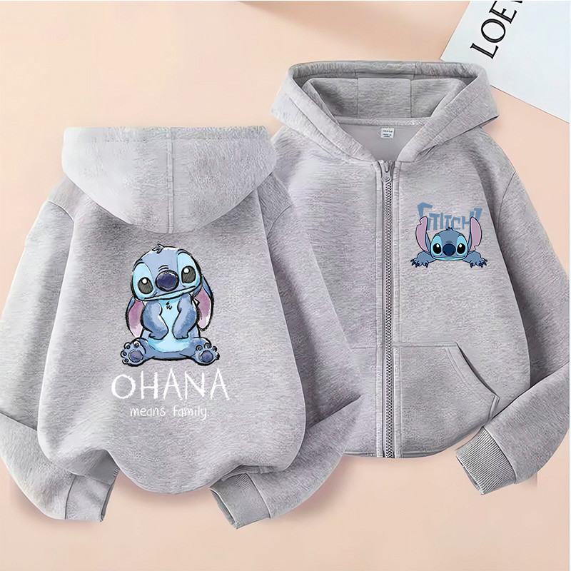 Blusa de Moletom com Ziper Casaco Quentinho Capuz Bolso Lillo Stitch Infantil Infanto Juvenil Meninas Cinza Rosa