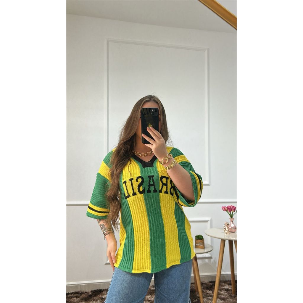 Blusa de Tricot Crochê Brasil Copa Camisa Decote V Oversized 36 ao 46