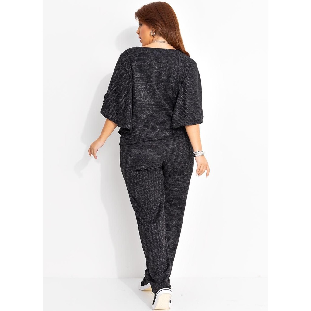 Blusa preta, modelagem solta, decote redondo, manga com babado, comprimento básico, material malha com lurex.