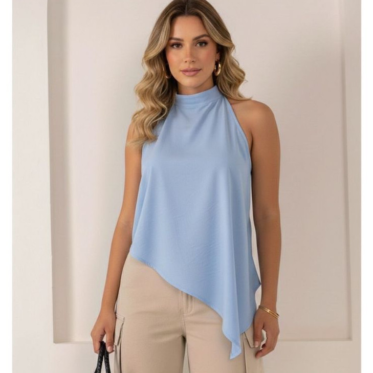 Blusa Feminina Bata Frente Unica Assimétrica Amarração no Pescoço Tecido Crepe Duna Elegante Casual Estilosa