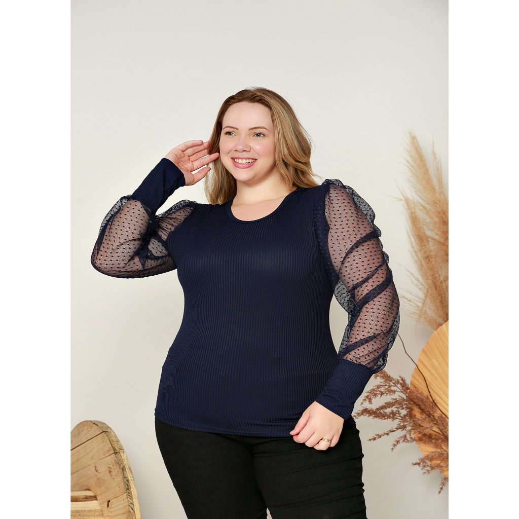 Blusa Feminina Canelada Manga Tule Comprida ( com leve defeito )