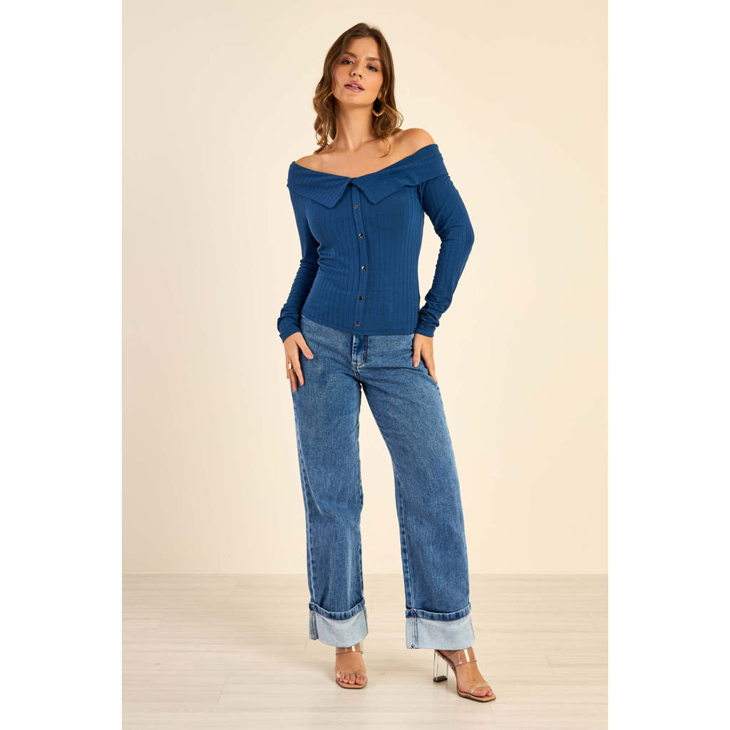 Blusa Feminina Canelada Ombro a Ombro Marialícia Azul