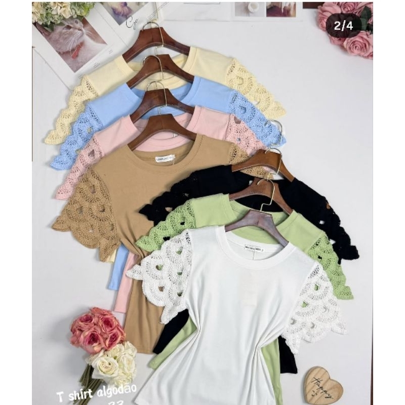 Blusa feminina de algodão/ Manga crochê / Confortável