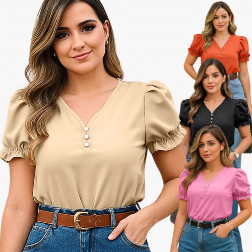 Blusa Feminina Elegante com Manga Princesa e Detalhe em Pérola Descubra a combinação perfeita Confeccionada em tecido crepinho de altíssima qualidade, ela traz um toque suave e fresco à pele, ideal para te acompanhar nas temperaturas mais quentes. O material não amassa, não desbota, é resistente, durável e lavável na máquina, mangas princesa com elegantes pregas, que valorizam os ombros. é um charmoso detalhe em pérola na parte frontal traz ainda mais delicadeza à peça. E o melhor: o tecido não é transparente, proporcionando segurança e elegância em todas as ocasiões. essa blusa é a escolha certa para compor produções com calça, saia ou short, transitando facilmente entre looks casuais, sociais ou mais sofisticados, essa peça vai conquistar seu coração e transformar seu visual. Um item indispensável para mulheres que valorizam estilo, conforto e qualidade em cada detalhe. Garanta já a sua! TABELA DE MEDIDAS DA BLUSA TAMANHO. BUSTO. QUADRIL. COMPRIMENTO M=38-42. 100 CM. 106 CM. 58 CM G=42-44. 104 CM. 112 CM. 60 CM GG=44-46. 110 CM. 118 CM. 63 CM