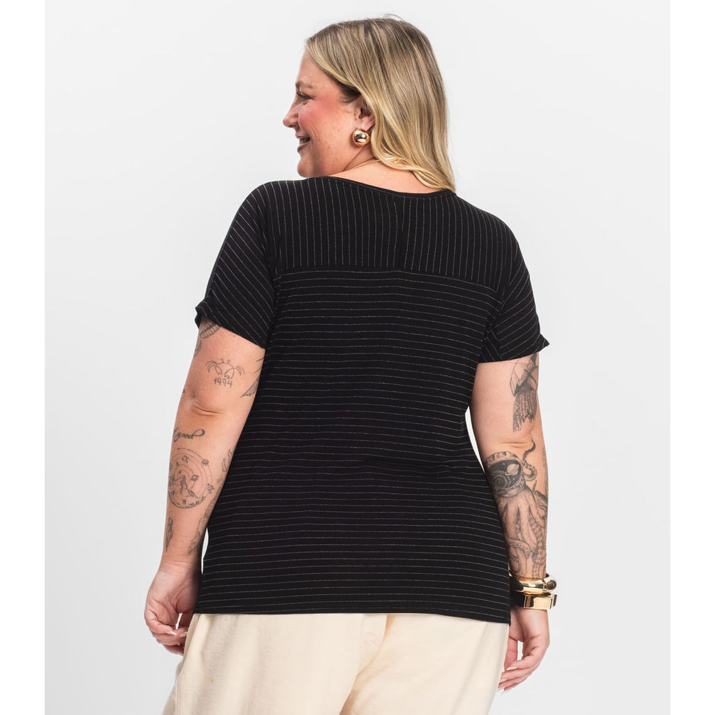 Blusa feminina Plus Size Infinita confeccionada em malha Stripe Lurex, com toque leve e sofisticado. Possui recortes estratégicos com as listras em sentido vertical, decote com friso e pesponto duplo, mangas e barra com bainha e costura reforçada. Detalhe de etiqueta interna. Ideal para compor looks elegantes e modernos.