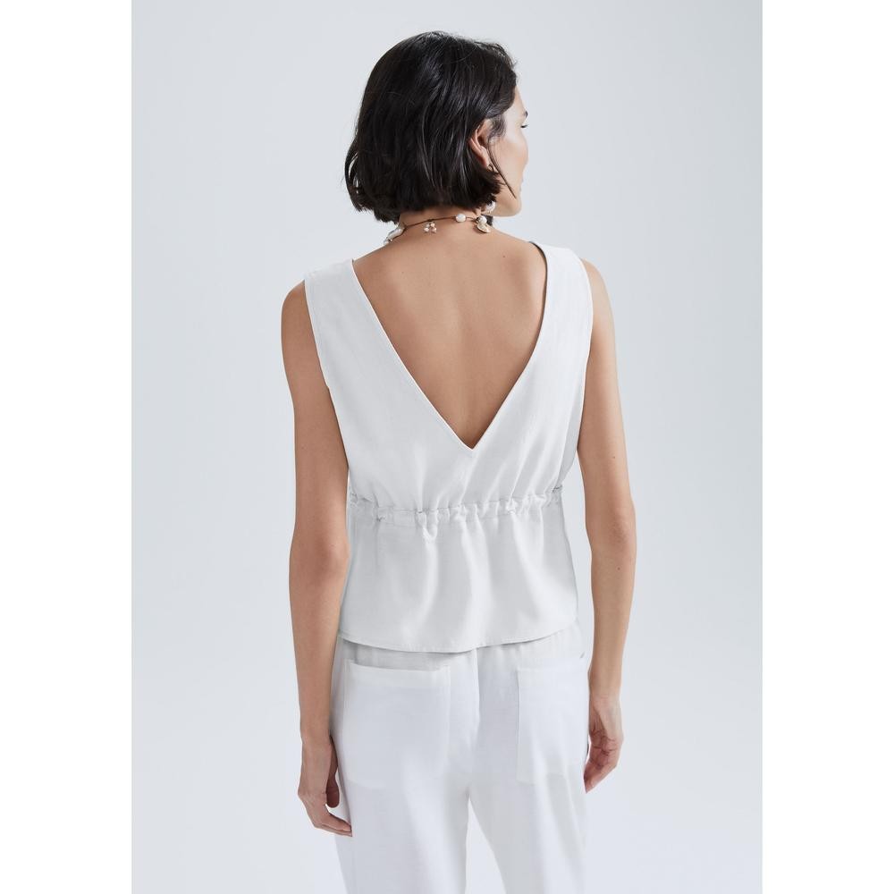 Conheça nossa blusa em tecido de linho, que combina leveza e elegância. Com design tipo cortininha, a frente aberta se fecha por amarração, criando um visual despojado. A canaleta e cordão na cintura permitem um ajuste perfeito. Ideal para dias quentes, essa peça é uma escolha versátil para compor diferentes looks!Detalhes da peça:Em tecidoModelagem amplaAlças largasDecote VAmarração frontalForro no busto