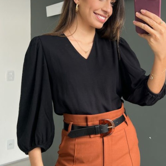 PERGUNTAS FREQUENTES: 1) Qual o tecido / material / pano da peça? Nossa Blusa é toda feita em Crepe Duna - 100% Poliéster , com costuras reforçadas e um ótimo caimento ao corpo deixando você deslumbrante para qualquer ocasião. 2) O Produto é exatamente o mesmo da foto?? Sim. O produto é exatamente o mesmo da foto acima. 3) O tecido Possui Elasticidade (elastano)?? Não possui elastano, porém pode efetuar a compra de acordo com o tamanho acima que servira perfeitamente. 4) Tem outros tamanhos? Trabalhamos do tamanho P (36/38) a G (58) P M G GG G1 G2 G3 36/38 40/42 44/46 46/48 50/52 54/56 58 BUSTO - CIRCUNFERÊNCIA 84 92 102 112 124 128 138 CINTURA - CIRCUNFERÊNCIA 88 94 104 114 126 130 140 COMPRIMENTO DA BLUSA 54 58 59 64 67 68 71 BRAÇO - CIRCUNFERÊNCIA 30 32 34 44 50 54 58 COMPRIMENTO DA MANGA 40 41 42 43 45 47 49 Blusa Manga 3/4 Manga levemente bufante Decote V - COMPOSIÇÃO DO TECIDO PRINCIPAL: CREPE DUNA 100% POLIESTER - VARIAÇÕES NAS CORES: as fotos dos produtos possuem leve edição para ressaltar as cores, portanto podem apresentar uma pequena variação de cor. Além disso, cada tela (monitor ou celular) possui uma calibragem diferente, o que altera na percepção dos tons. Tire todas suas dúvidas aqui no campo de perguntas. Estamos à disposição. Confiram também nossos outros modelos Obrigada pelo visita e ótimas compras