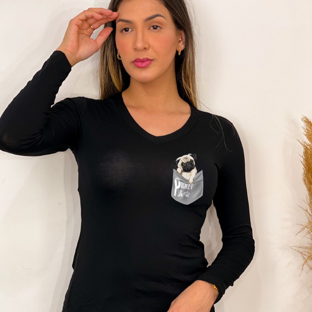 blusa feminina estampa pug no bolso Gola V manga Longa moda basica