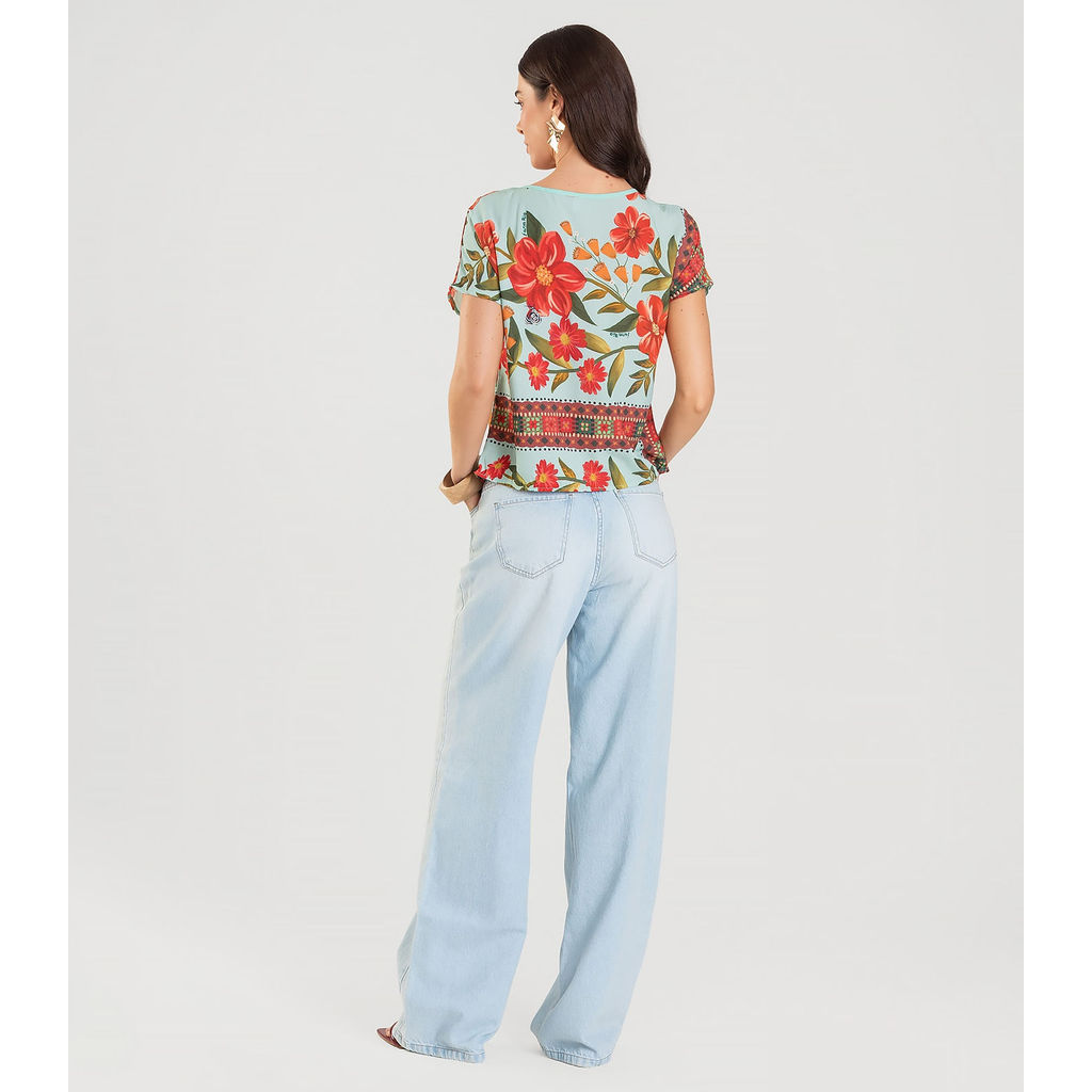 Blusa Feminina Estampada Infinita Cor, confeccionada em Viscose Khyara, leve e macia ao toque. Possui decote em V com abertura frontal e fechamento por botão, trazendo um toque moderno e delicado. As mangas curtas sem cava oferecem caimento mais solto e confortável, ideal para compor looks versáteis e estilosos em dias mais quentes.