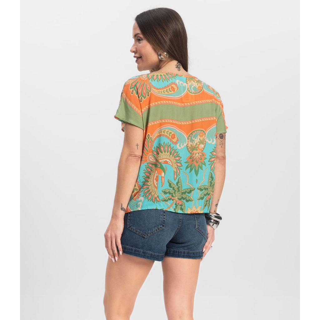 Blusa Feminina Estampada Infinita Cor, confeccionada em Viscose Khyara, leve e macia ao toque. Possui decote em V com abertura frontal e fechamento por botão, trazendo um toque moderno e delicado. As mangas curtas sem cava oferecem caimento mais solto e confortável, ideal para compor looks versáteis e estilosos em dias mais quentes.