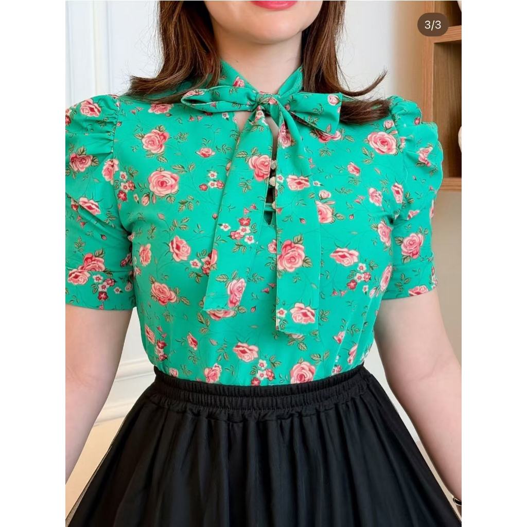 Blusa Feminina Estampado Flor Social Manga Curta Bufante com laçinho Moda evangélica -088