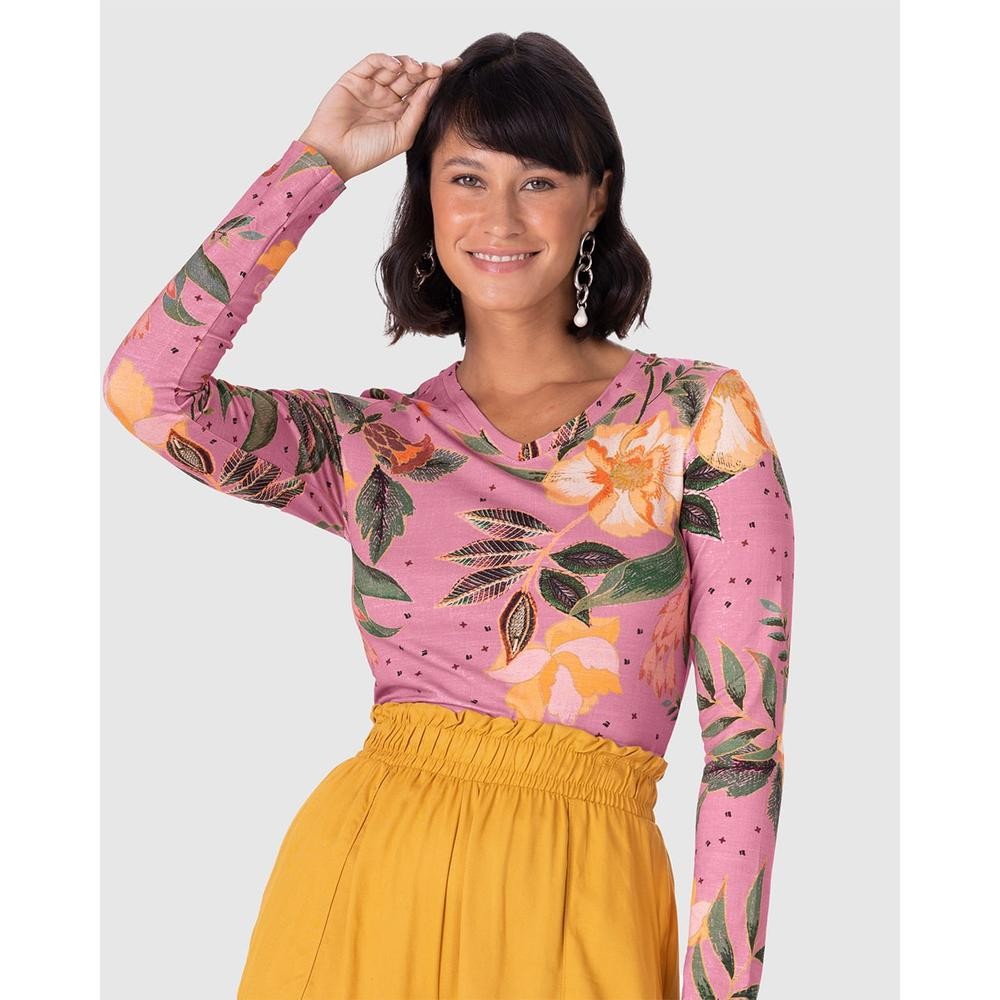 Blusa feminina feita em viscose stretch conforto. Apresentando uma blusa estampada com caimento mais ajustado ao corpo, é a peça perfeita para todas as ocasiões. Também possuindo gola V e mangas longas, ela foi feita em viscose stretch conforto, que tem caimento impecável, super confortável e versátil para os dias mais quentes. É Queridinha por aqui e sempre está presente nas nossas coleções. Sendo uma blusa curinga para o dia a dia, que possibilita muitas combinações. • Blusa Ajustada em Viscose Stretch • Gola V • Mangas Longas