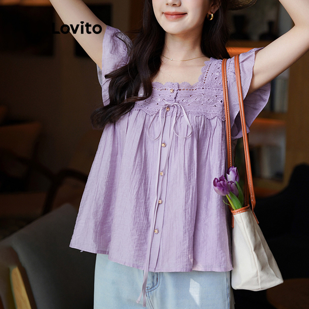 Blusa Feminina Lovito Primavera/Verão com Babados e Gola Contrastante, Estilo Casual L121MD622