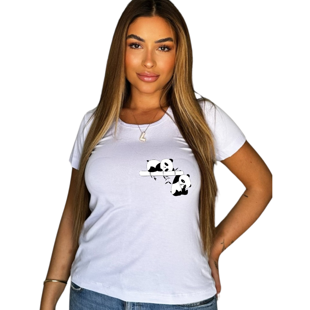 Blusa Feminina Manga Curta Estampa Dois Pandinhas Fofo Dorminhoco 🐼💤