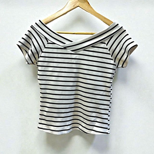 Blusa Feminina Manga Curta Listrada Preto e Branco com Bojo Tamanho P Ombro a Ombro Decote em V | Brechó | Desapegos