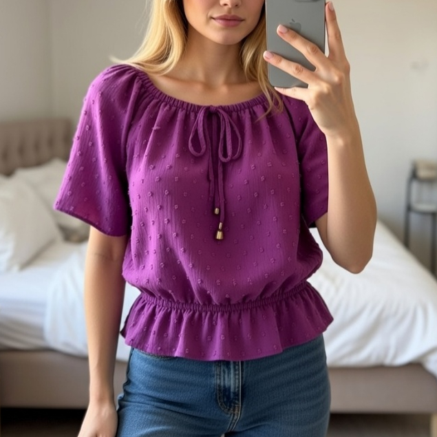 👚 Blusa Feminina Ombro a Ombro em Duna Pipoca com Elástico e Babado – Leve & Elegante ✨ Destaques e Detalhes do Produto: ✨ • Tecido: Chiffon Pipoca Texturizado de Alta Qualidade • Gola: Ombro a Ombro (Estilo Ciganinha) com Elástico • Manga: Curta, Soltinha e Confortável • Corte: Modelagem Leve com Elástico na Cintura • Estilo: Casual Chic, Feminino e Versátil 📌 Detalhes Importantes: • Elástico no decote para melhor ajuste • Elástico na cintura que valoriza o corpo • Barra com babado delicado