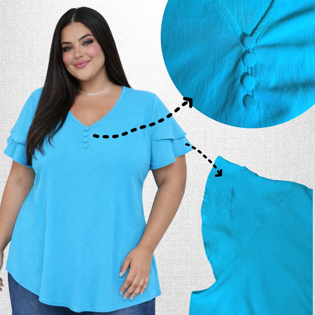 Blusa Plus Size Manga Curta com Babado Duplo Blusa confeccionada em tecido Duna leve e fluido, com mangas curtas em babado duplo e botões encapados. Modelagem confortável, com ótimo caimento e acabamento elegante. Ideal para looks casuais ou mais arrumados. 📏 Medidas: • GG/G1 (44 ao 48): Busto 120 cm | Quadril 126 cm | Comprimento 67 cm • G2/G3 (48 ao 54): Busto 133 cm | Quadril 148 cm | Comprimento 73 cm (Variação de até 2 cm) 🧵 Diferenciais: • Produção própria • Envio em 24h