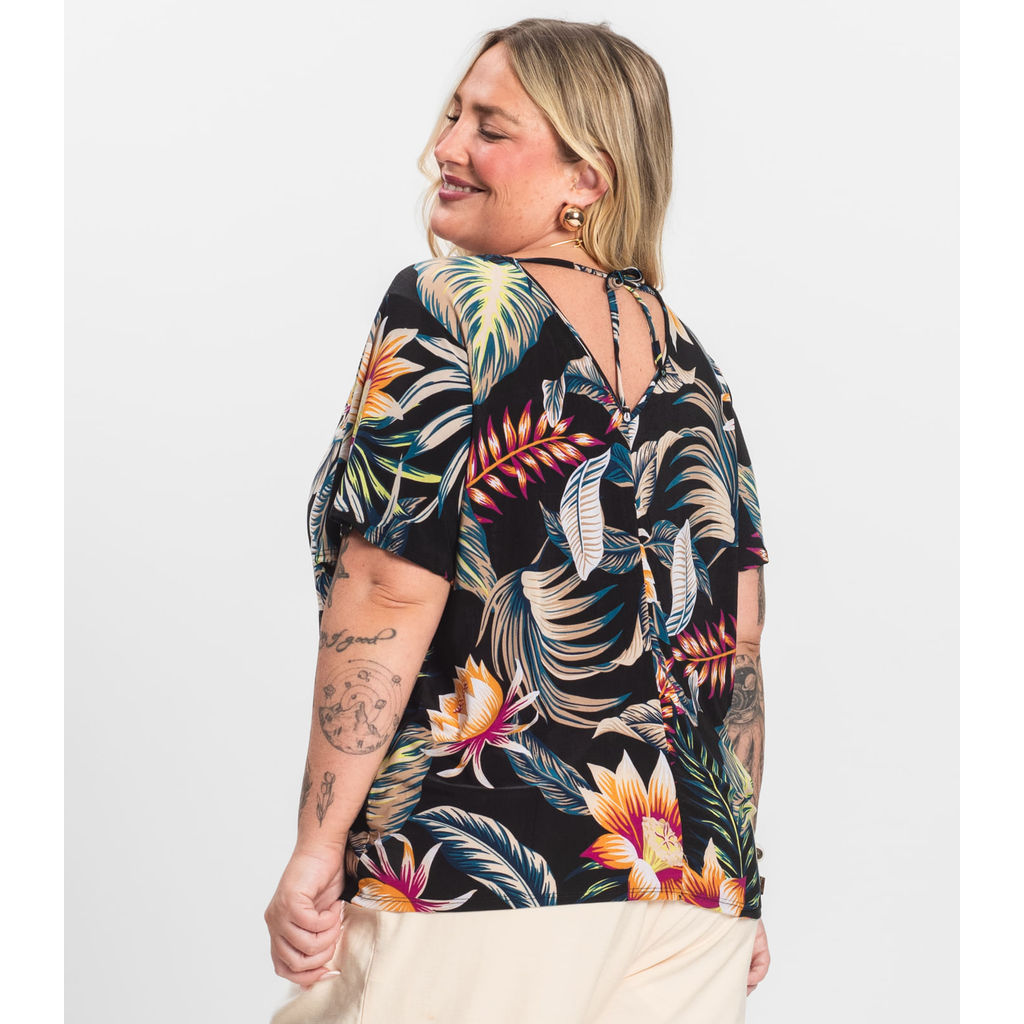 Blusa Feminina Plus Size Infinita Cor, confeccionada em malha Spandex Print Premium, com toque macio e ótimo caimento. Possui decote em V com acabamento em friso, mangas amplas com detalhe ondulado e barra com costura dupla. Nas costas, o decote também é em V com laço ajustável e recorte central para melhor modelagem. Ideal para quem busca estilo, conforto e um visual moderno e delicado.