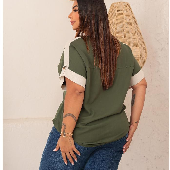 Blusa Feminina Plus Size Viscolinho com Linho no Ombro e Manga de Botão Social Casual Chic G1 G2 G3