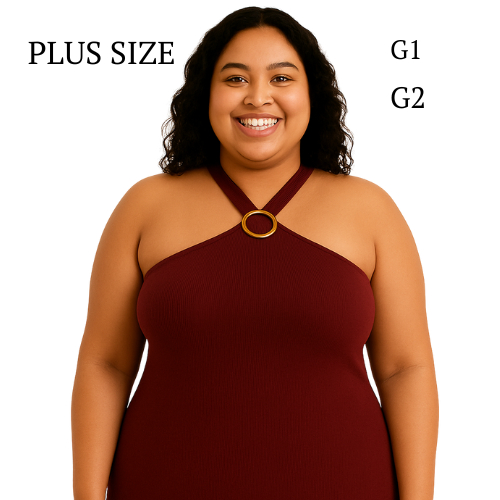 Blusa Regata Feminina Plus Size com fivela – Estilo e Sofisticação Aposte em um visual moderno e elegante com essa regata plus size! Com modelagem justa ao corpo, tecido canelado de alta elasticidade e detalhe de fivela dourada no decote, essa peça valoriza o colo e traz um charme especial ao look. Ideal para compor produções tanto casuais quanto mais arrumadas. 🧵 Tecido: Malha canelada com elastano ✨ Detalhes que encantam: Fivela decorativa dourada no decote Alças largas cruzadas no pescoço (modelo halter) Caimento ajustado que valoriza a silhueta 📏 Tamanhos Disponíveis: G1 (veste do 48/50) G2 (52/54) Combine com jeans, saias ou alfaiataria e arrase em qualquer ocasião!