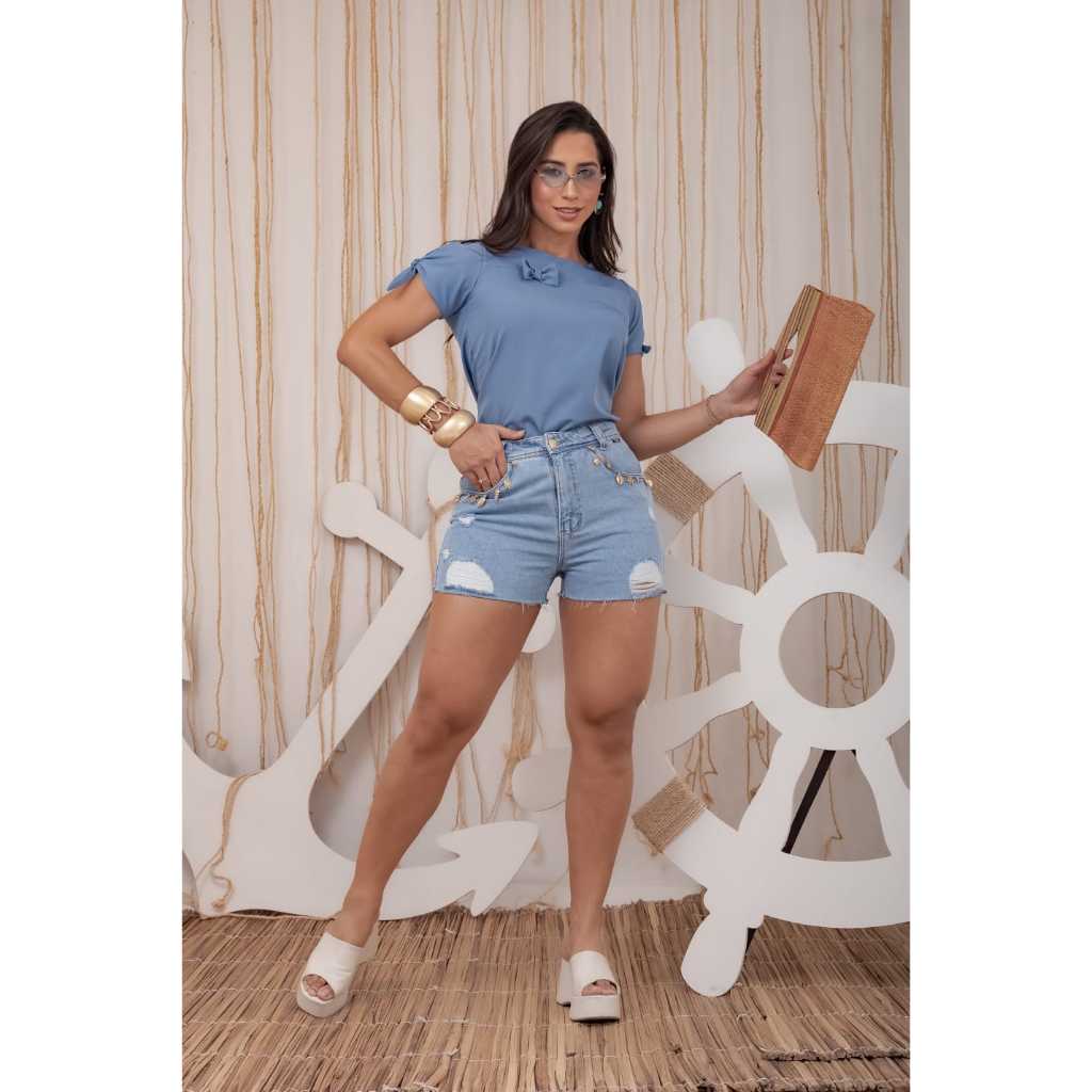 A blusa feita em tecido crepinho tem um charme especial justamente por causa da textura e do caimento desse material. O crepinho é um tecido leve, com toque levemente granulado e aparência fosca, que proporciona um visual sofisticado sem perder a casualidade. Características do crepinho na blusa Caimento fluido: o tecido acompanha os movimentos do corpo sem marcar, deixando o look confortável e elegante. Textura discreta: o aspecto levemente crespo dá um diferencial em relação a tecidos lisos, trazendo mais personalidade. Versatilidade: combina bem tanto em peças casuais (como shorts jeans, como na produção da foto) quanto em looks mais arrumados, se usado com saias ou calças de alfaiataria. Conforto térmico: por ser leve, é ótimo para climas quentes, mas também pode ser usado em sobreposições em dias mais frescos. Estilo da peça No caso dessa blusa: O laço no busto e as mangas amarradas reforçam a delicadeza e feminilidade. O crepinho valoriza esses detalhes, já que o tecido não pesa e deixa os laços com movimento natural.