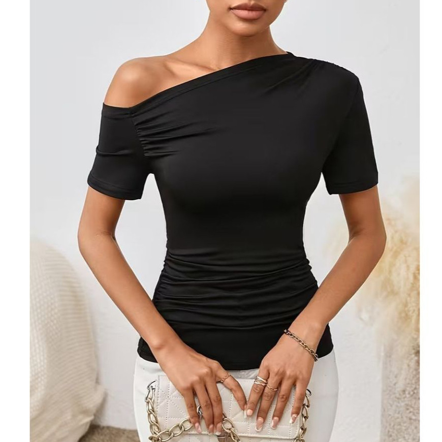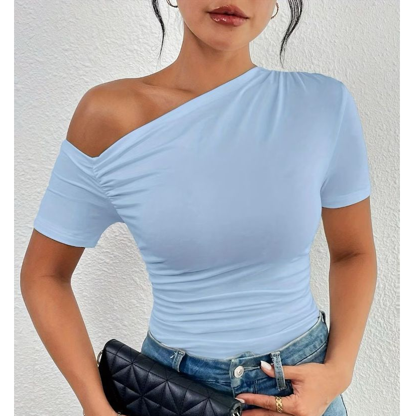 Blusa Feminina Suplex Premium com Manga Curta Assimétrica Drapeada Elegante Casual Ombro a Ombro Estilosa