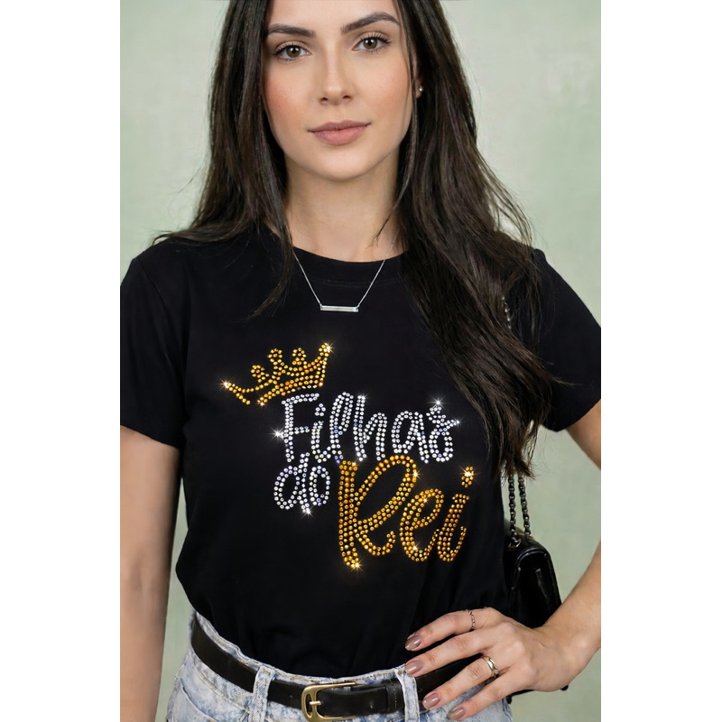 Blusa Feminina T-shirt Estampa Filhas do Rei Com Strass Brilhante