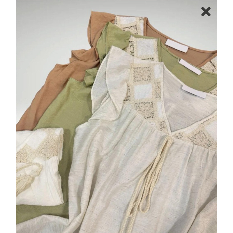BLUSA FEMININA TECIDO LEVE MANGUINHAS COM BABADOS GOLA V TRABALHADA NO CROCHÊ E CRODINHA PARA AMARACÃO