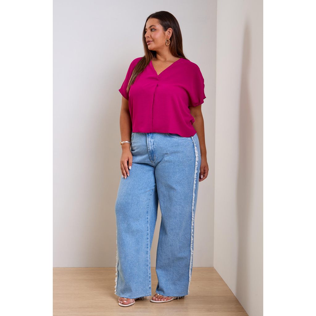 A Blusa Marialícia é uma peça coringa para composições elegantes e confortáveis. Feita em tecido texturizado, ela possui comprimento regular, mangas curtas e caimento soltinho, proporcionando leveza ao visual. O decote V com detalhe em prega valoriza o colo, enquanto seu design minimalista garante versatilidade. Perfeita para composições casuais e sofisticadas, pode ser usada com calças, saias ou shorts. Invista nesse look que se adapta a diversos estilos e ocasiões.Modelo veste G1 Medidas da modelo: 111cm de busto; 122cm de quadril; e 96cm de cintura
