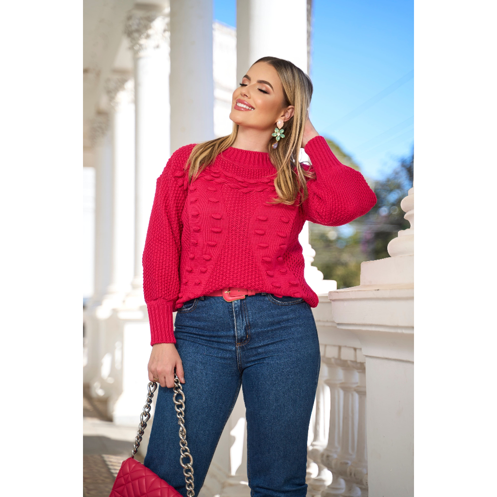 Blusa Feminina Tricot Moda blogueira Manga Longa Bufante Gola Redonda Pelotas Outono/Inverno 2025
