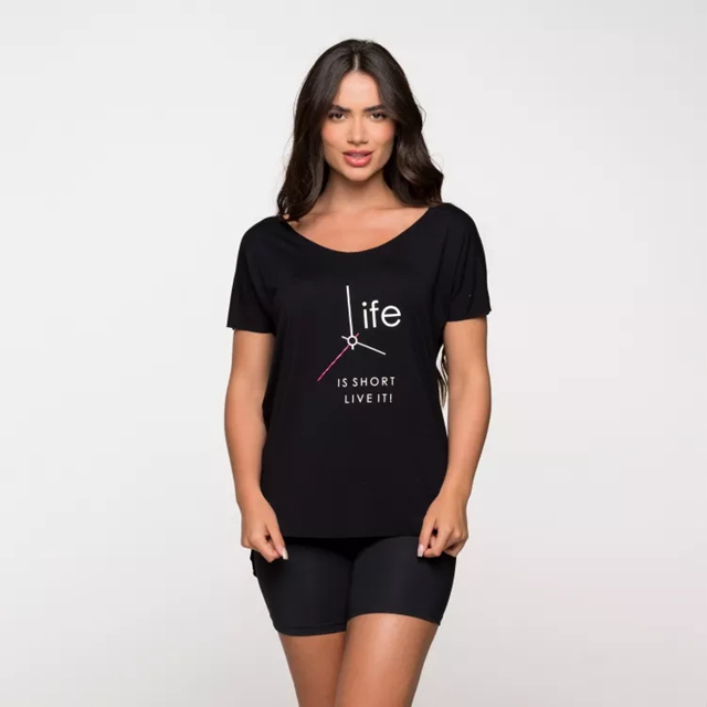 Blusa Fitness Feminina Academia Viscolycra Basica Preta Com Estampa Life