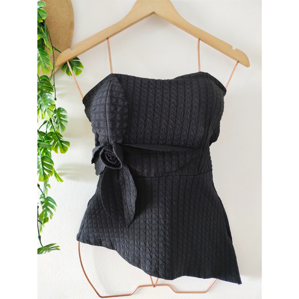 modelo tomara que caia; possui bojo; possui elástico na parte de cima; possui detalhe em flor; tecido com relevo; modelo de barra com ponta; tecido canelado anaruga; 03,5% elastano composição 48,25% poliéster 48,25% algodão modelo tamanho único. Os computadores e celulares usados são diferentes, com isso, podem exibir cores de formas diferentes à cor real do item, variando ligeiramente das imagens acima, devido a configuração da resolução de cada aparelho. Por escolha do fornecedor peças tamanho único podem conter etiqueta tamanho P, M ou G. Prazo de Entrega: O prazo de entrega dos produtos varia de acordo com a região e a opção de envio escolhida no momento da compra. Informe seu CEP no campo específico e consulte as opções disponíveis para a sua região. Peça medida fora do corpo e sem esticar. Medidas: busto 56 cm, cintura 58 cm e comprimento 39 cm. Medidas da Modelo Altura: 1,62 cm Busto: 84cm Cintura: 64 cm Quadril: 104 cm