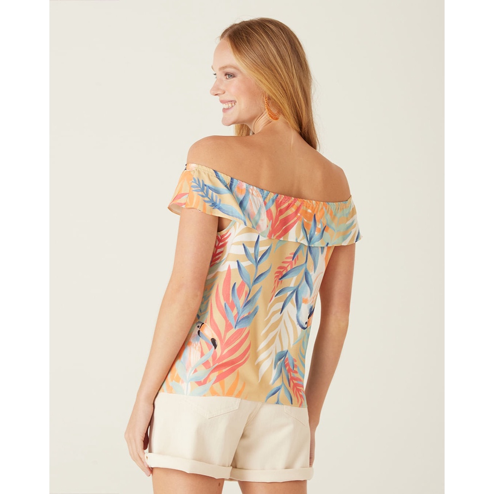 Blusa confeccionada em viscose. Modelo possui decote ombro a ombro e mangas curtas. Estampa corrida de folhagem em rapport digital, para melhor qualidade de imagem. Uma peça leve e ideal para o dia a dia, do trabalho aos momentos de lazer com a família. Invista com short da mesma estampa para criar um visual harmônico. Decote: Ombro A Ombro Mangas: Curtas