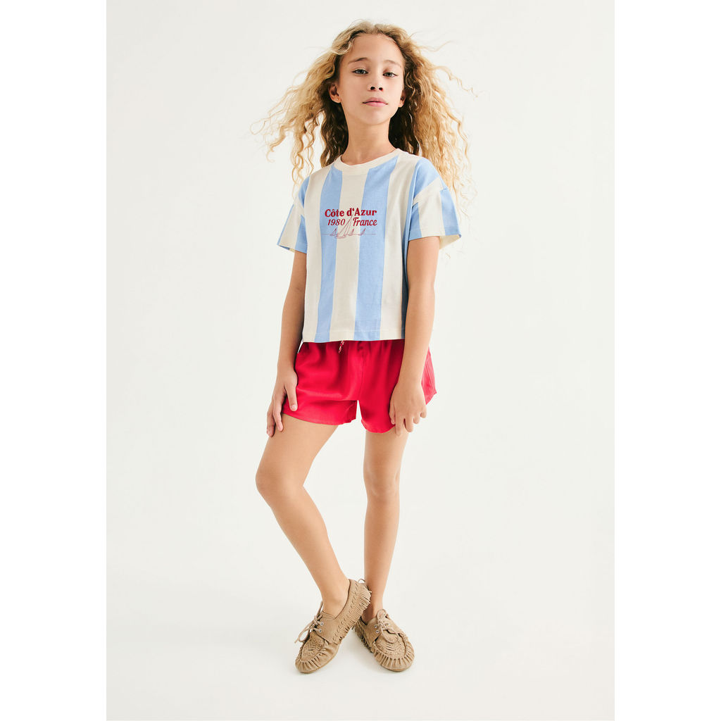 Blusa infantil confeccionada em malha macia e confortável, com modelagem boxy que garante um visual moderno e soltinho no corpo. Possui cavas deslocadas, mangas curtas e decote redondo. A combinação da estampa rotativa com a localizada adiciona um toque de estilo e originalidade à peça.Detalhes da peça:Malha de algodãoModelagem boxyMangas curtasDecote redondoListradaEstampa localizada