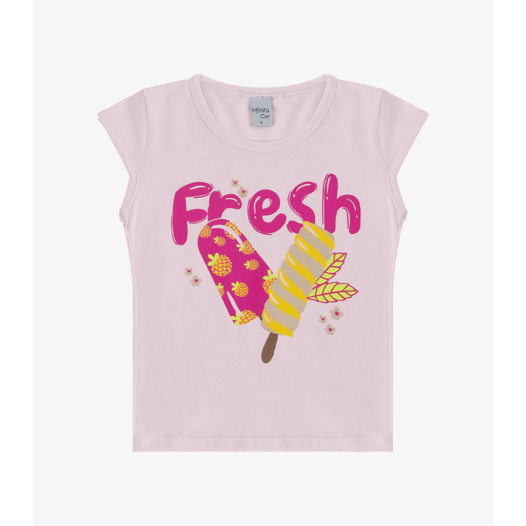 Blusa Infantil Menina Infinita Cor, confeccionada em malha cotton leve, proporcionando conforto e maciez. Possui decote redondo com friso, manga curta estilo cava e estampa localizada "Fresh" na parte frontal. As costas são lisas, com acabamento limpo e discreto. O comprimento da peça vai até o início do quadril, ideal para compor looks casuais, frescos e despojados no dia a dia.