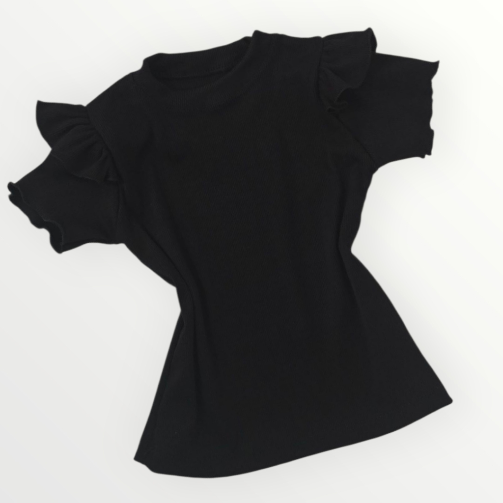 A blusa infantil é confeccionada em tecido ribana canelado e apresenta mangas com babados, ou "fru-fru". Características do Produto e Material Tecido Ribana: É um tecido de malha com textura canelada (efeito de costela) e elasticidade, geralmente devido à presença de elastano na composição, o que permite que a peça se ajuste bem ao corpo e ofereça conforto. Muitas vezes, a composição inclui uma alta porcentagem de algodão, tornando-a macia e respirável, ideal para roupas infantis. Design: A blusa possui mangas curtas com babados, ou detalhe de "fru-fru" na bainha das mangas, o que confere um visual delicado e charmoso. Conforto e Praticidade: O tecido ribana é conhecido por proporcionar mobilidade e ser fácil de cuidar, pois não amassa com facilidade. Além disso, o material é agradável ao toque, antialérgico e não aquece, sendo uma opção versátil para diversas temperaturas.