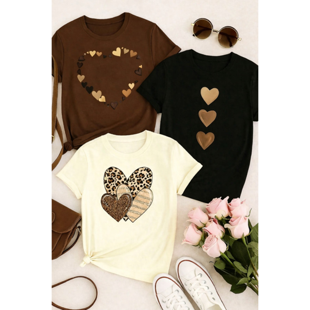 Blusa Kit com 3 blusas femininas de algodão premium estampa coração oncinha marrom