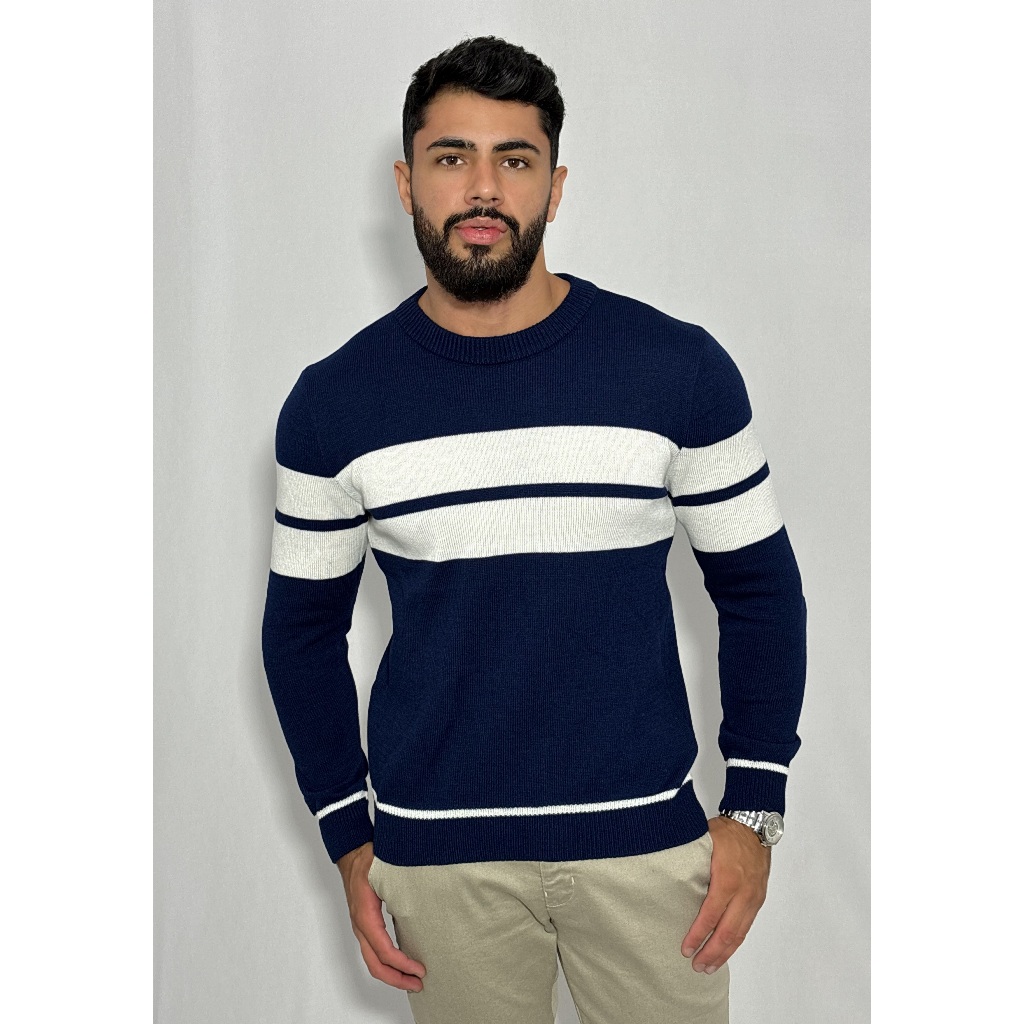 Blusa Masculina Básica Meia Malha com Listras – Estilo e Conforto no Dia a Dia Blusa básica, versátil e moderna, feita em tricot estilo meia malha com toque macio e ótimo caimento. O destaque fica por conta das duas listras largas no peito, que adicionam personalidade ao visual sem perder a simplicidade. Ideal para compor looks despojados e estilosos com zero esforço. - Modelagem confortável - Listras largas que trazem identidade - Perfeita para uso casual - Leve, respirável e com elasticidade Composição: Lã Hb 70%- Poliéster 30%- Acrílico Tamanhos e Medidas: Tamanho M Comprimento medido do ombro próximo a gola até barra: 69 cm Largura do busto (do final de uma cava à outra): 43 cm Comprimento da cava: 24cm Comprimento da manga: 64 cm Tamanho G Comprimento medido do ombro próximo a gola até barra: 71 cm Largura do busto (do final de uma cava à outra): 45cm Comprimento da cava: 26 cm Comprimento da manga: 66 cm Tamanho GG Comprimento medido do ombro próximo a gola até barra: 74 cm Largura do busto (do final de uma cava à outra): 48 cm Comprimento da cava: 28cm Comprimento da manga: 67 cm O tricot pode ter uma pequena variação quanto o seu tamanho por serem peças exclusivas, variando a margem de 1cm. Cuidados e Lavagem: O tricot é uma peça delicada, siga as instruções de uso e lavagem para prolongar sua durabilidade do seu tricô. -Prefira lavar à mão, ao invés de usar máquinas de lavar. -Evite pendurar a peça no varal verticalmente. O peso da água pode causar deformações na roupa. -Consulte as indicações de temperatura na etiqueta antes de passar a peça. -Mantenha as peças dobradas, nunca pendure sua peça em cabides.