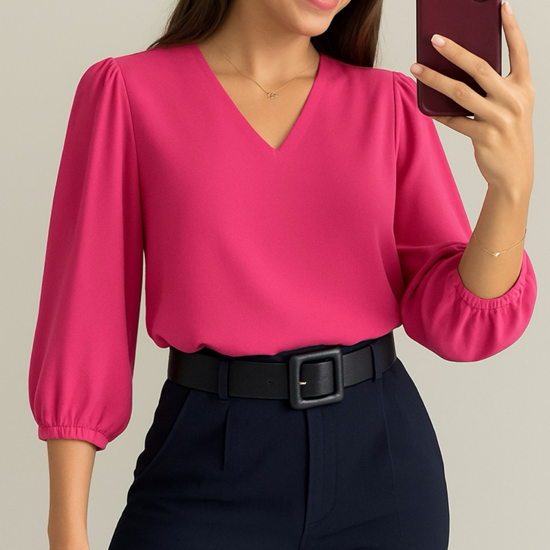 Blusa Manga 3/4 Detalhe Em V Novas Cores Verão Tendência Moda Feminina