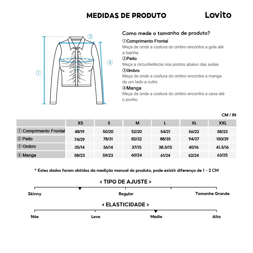 ✅DESTAQUES -❤️Decote Quadrado -❤️Manga Longa ✅DESCRIÇÕES Estampa: Liso Coleção: Outono/Inverno Tamanho Plus: Não Composição: 96% Poliester 4% Elastano Tipo de Modelagem: Blusa Manga Longa Transparência: Não Elasticidade:Alta Região de Origem: Brazil ✅O PACOTE INCLUI 1 Blusa ✅INTRODUÇÃO À LOVITO A Lovito é uma marca emergente que acredita no poder feminino, comprometida em oferecer opções de roupas elegantes e acessíveis para diferentes estilos, necessidades e identidades. Acreditamos que a moda deve ser divertida, libertadora e fazer você se sentir bem. Afinal, o melhor acessório para qualquer look é a autoconfiança. ✅NOTAS DE COMPRA Compare suas medidas com nossa tabela disponível no site. Lembre-se de que, por serem feitas manualmente, as medidas podem variar de 1 a 2 cm. As cores dos produtos também podem ter pequenas diferenças em relação às fotos, dependendo da iluminação e das configurações do seu dispositivo. Siga nossa loja e conheça novos itens e as melhores ofertas para você!! Se você tiver alguma dúvida, entre em contato conosco e responderemos o mais rápido possível.😊