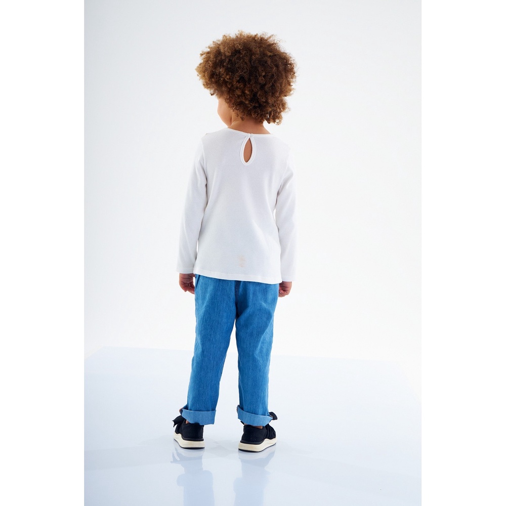 A blusa perfeita para as pequenas princesas! Confeccionada em ribana suave, essa blusa de manga longa é o complemento ideal para as meninas que amam estar na moda. Possui gola com aviamento de renda, que traz um toque delicado e elegante ao visual. O bordado com detalhe em escrita dá um toque divertido e criativo. Fechamento com botão em formato de gota nas costas para facilitar vestir.Tecido: RibanaComposição: 96%algodão 4%elastanoDecote/Gola: RedondoModelagem: JustaForro: NãoComprimento da Manga: LongaInformações Extras: Com gota