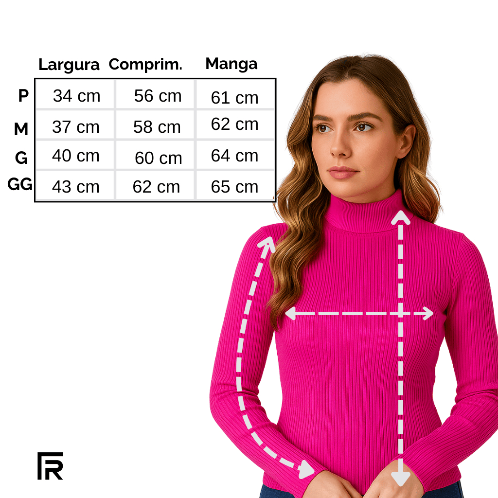 Blusa Gola Alta Canelada - O INVERNO CHEGOU!!! Nossa blusa em ribana canelada é consolidada e uma das mais vendidas há 5 temporadas. Um item essencial no guarda-roupa feminino nesse inverno, seja em lugares com frio intenso ou mais ameno. Nosso formato de blusa é o ideal, pois ajusta a silhueta sem apertar no quadril ou no busto. Quentinha mais respoirável, essa blusa é o tipo da peça para ter numa variedade de cores em casa. Material: Ribana PAP Algodão Penteado e Fibras de Poliéster. Composição: Algodão principalmente Modelagem: Ajustada (VER FOTOS COM TODAS MEDIDAS) Cores Disponíveis: BRANCO, PRETO, ROSA HIBISCO, CACAU, MESCLA MARINHO. Tamanhos: P ao GG Medidas: P - comprimento: 56 // largura: 34 M - comprimento: 58 // largura: 36 G - comprimento: 60 // largura: 39 GG - comprimento: 62 // largura: 41 Importante: Pela característica e construção da malha, ELA PRATICAMENTE NÃO ENCOLHE!!!! Compre e se prepare para querer todas as cores - em breve lançamentos. ***Após o pagamento, não é possível solicitar qualquer tipo de alteração por meio do chat. ***Não podemos enviar produtos diferentes dos que constam na nota fiscal, que é emitida imediatamente após o pagamento, com base nas informações selecionadas por você no momento da compra - Os itens são enviados exatamente conforme a sua solicitação de compra.