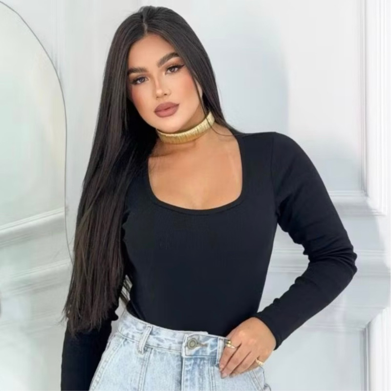 Blusa Manga Longa Gola Quadrada Malha Canelada Inverno Promoção