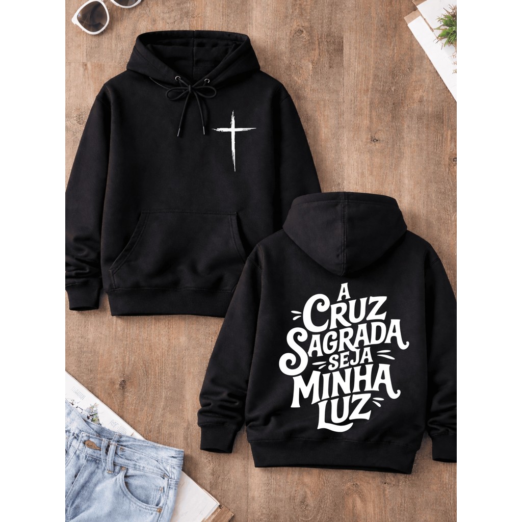 Blusa Moletom Canguru com Capuz Estampa Cristã a Cruz Sagrada Algodão Premium Várias Cores
