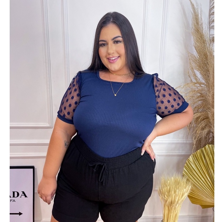 Blusa Plus Size Barata Blusinha Canelada Manga Princesa Tule Poá Bufante Moda Evangélica