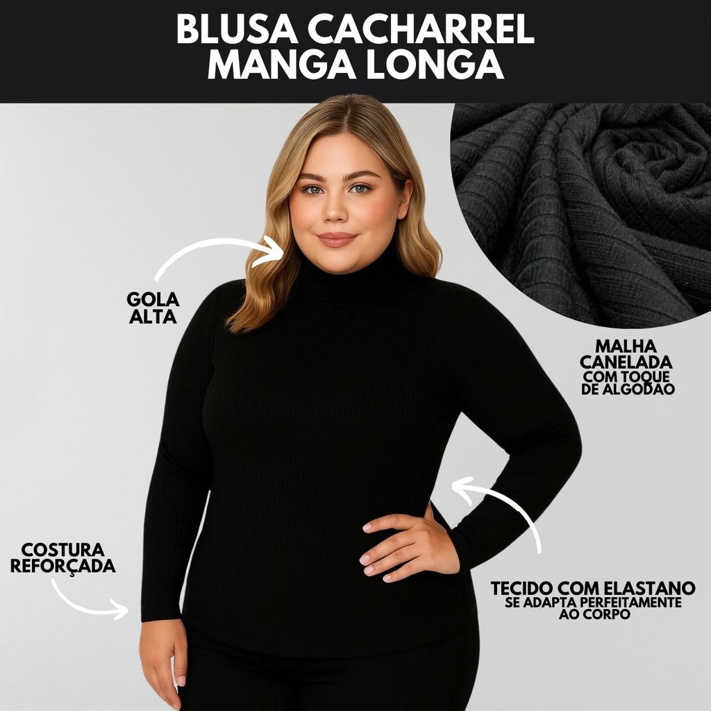 Blusa Manga Longa Blusa Gola Alta Cacharrel Feminino Blusa de Frio Feminina Segunda Pele Canelada - A solução pros dias frios! DIFERENCIAIS DO PRODUTO > Malha canelada com toque de algodão (Extremamente confortável) > Tecido com elastano (Se adapta perfeitamente ao corpo) > A costura é reforçada > Alta durabilidade > Não desbota > Resistente a inúmeras lavagens COMPOSIÇÃO Tecido: Malha Canelada com Toque de Algodão TAMANHO Slim Size (36 a 42) Busto: 82-94cm Cintura: 66-78cm Comprimento: 53cm Mid Size (44 a 50) Busto: 98-110cm Cintura: 82-94cm Comprimento: 61cm Plus Size (52 ao 58) Busto: 114-126cm Cintura: 98-110cm Comprimento: 61cm PRONTA ENTREGA - ENVIO IMEDIATO - ENTREGA RÁPIDA NO MESMO DIA OU DIA SEGUINTE PARA SP Para dúvidas estamos à disposição no chat!