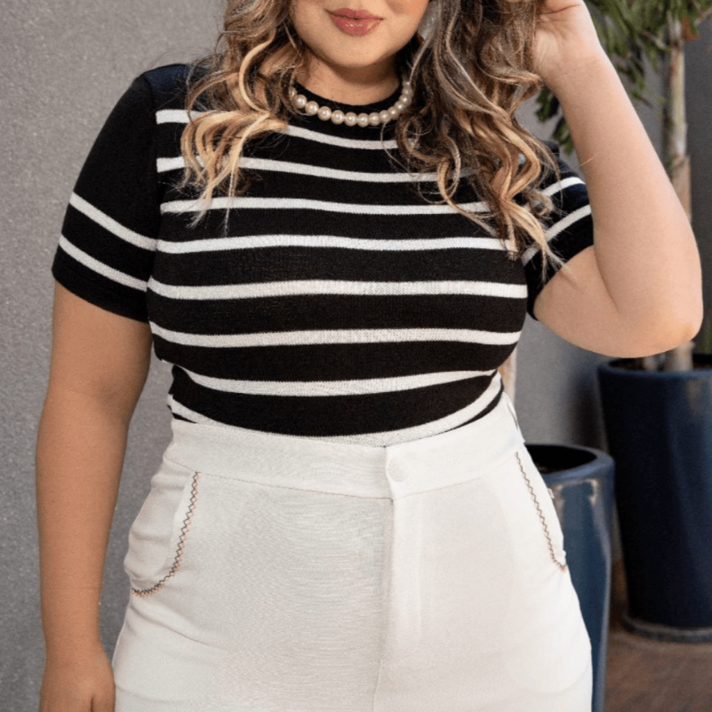 Blusa Plus Size Feminina Listrada Verão T-Shirt Listada Gola Redonda Manga Curta Tricot Elegante