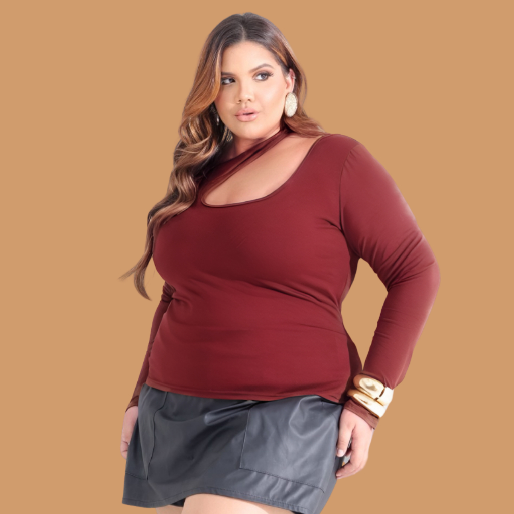 Blusa Plus Size Feminina Manga Longa Decote Choker Elegante Viscolycra Preto Vinho Marrom