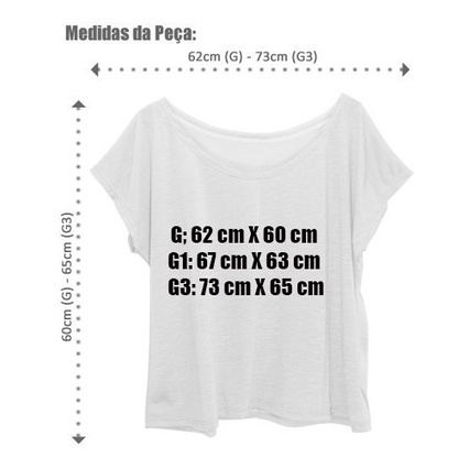 Tamanho Único G (veste busto de 75 cm a 100 cm) G1 (veste busto de 101 cm a 125 cm) G3 (veste busto de 126 cm a 140 cm) Tecido: poliéster Estampa: sublimação Manga Japonesa; Tecido: Flamê Medidas da peça G: 62cm largura X 60cm altura; Medidas da peça G1: 67 cm largura X 63 cm de altura; Medidas da peça G3: 73cm largura X 65cm altura; Composição 100% poliéster