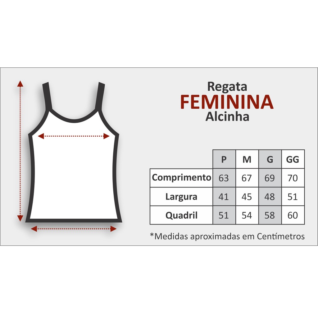 Regata Feminina de alcinha - 100% Algodão. Diversas cores. P: Comp.:63 - Larg.: 41 - Quad.: 51 | M: Comp.: 67 - Larg.: 45 - Quad.: 54 | G: Comp.: 69 - Larg.: 48 - Quad.: 58 | GG: Comp.: 70 - Larg.: 51 - Quad.: 60.